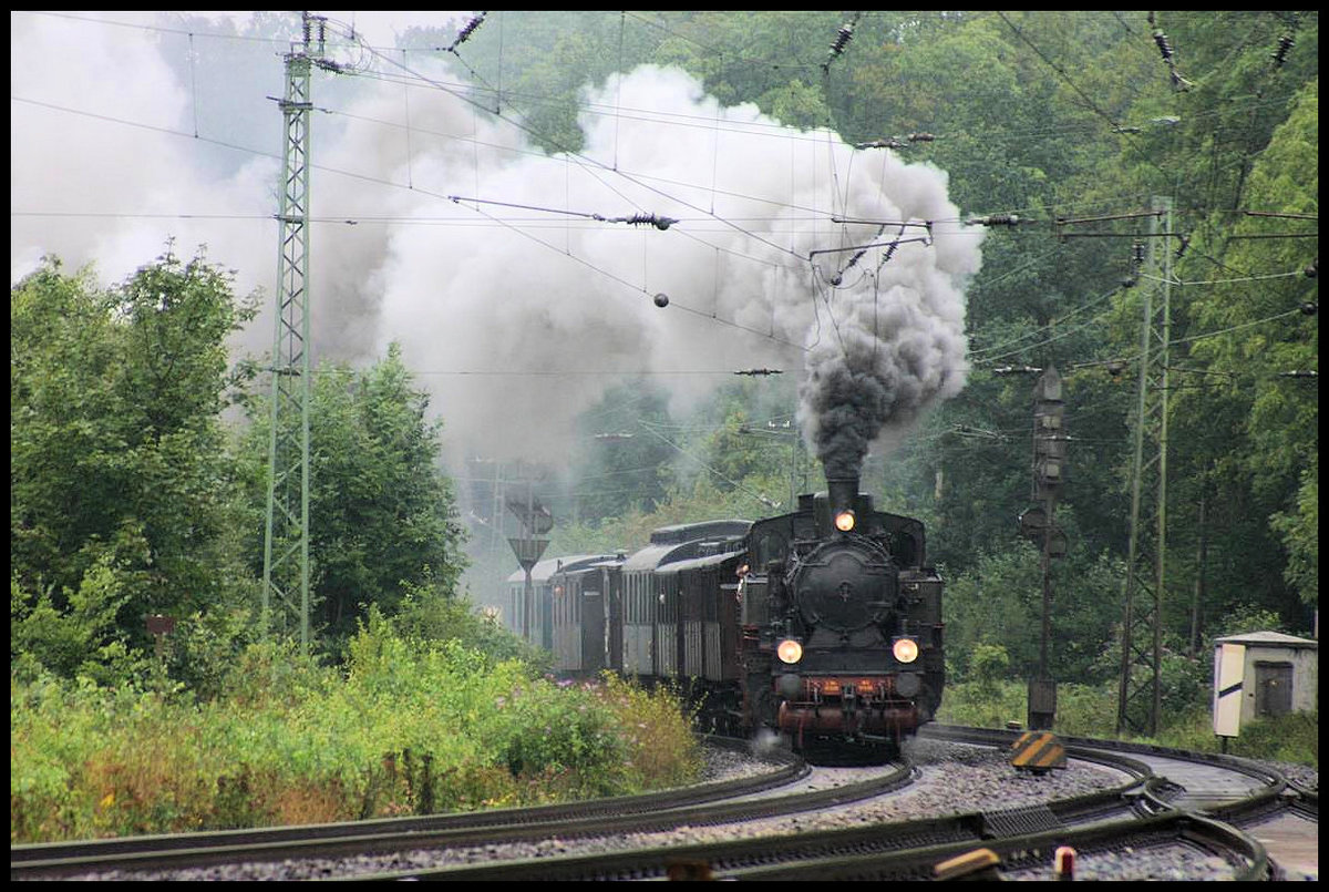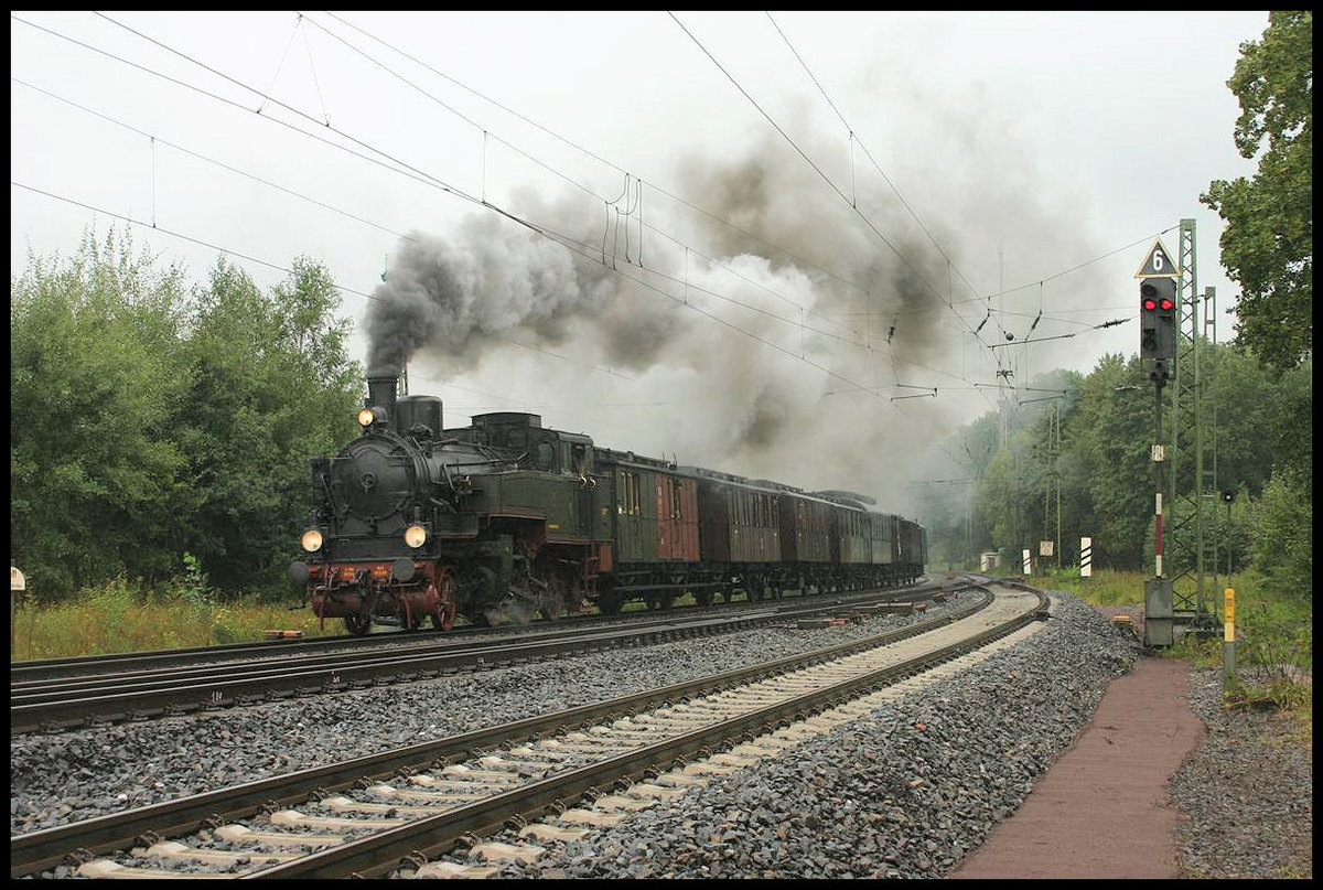 Mit einer eindrucksvollen Rauchwolke biegt hier am 3.9.2006 die historische Dampflok T 11 der Museums Eisenbahn Minden mit ihrem Preußenzug in die Eingangskurve des Bahnhof Hasbergen ein. Der Zug war auf dem Weg von Lengerich nach Osnabrück. Gerd Hahn