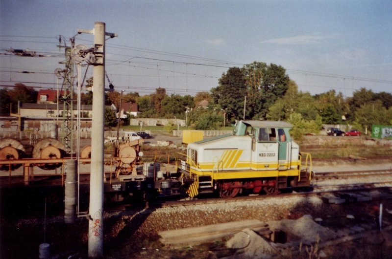 Dieses Bild stammt vom Ausbau der SFS Berlin-Hamburg. Hier ist KEG 0203 mit einem Kabeltrommelwagen bei der Arbeit in Falkensee zu sehen. Sascha Eltermann