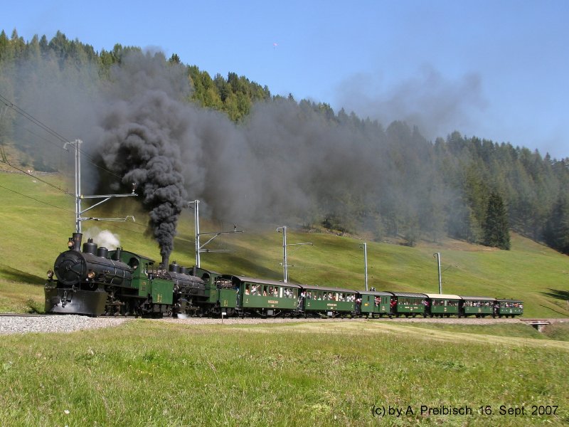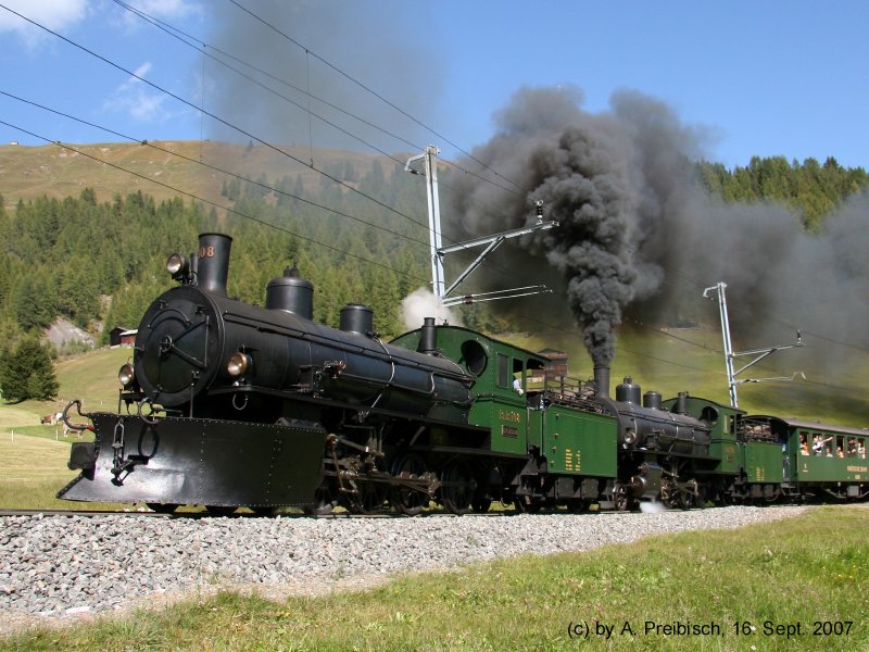 Doppeltraktion hinauf nach Davos-Wolfgang mit G 4/5 108 "Engiadina" mit großen Schneepflug und mit G 4/5 107 "Albula" am 16. September 2007. Andreas Preibisch