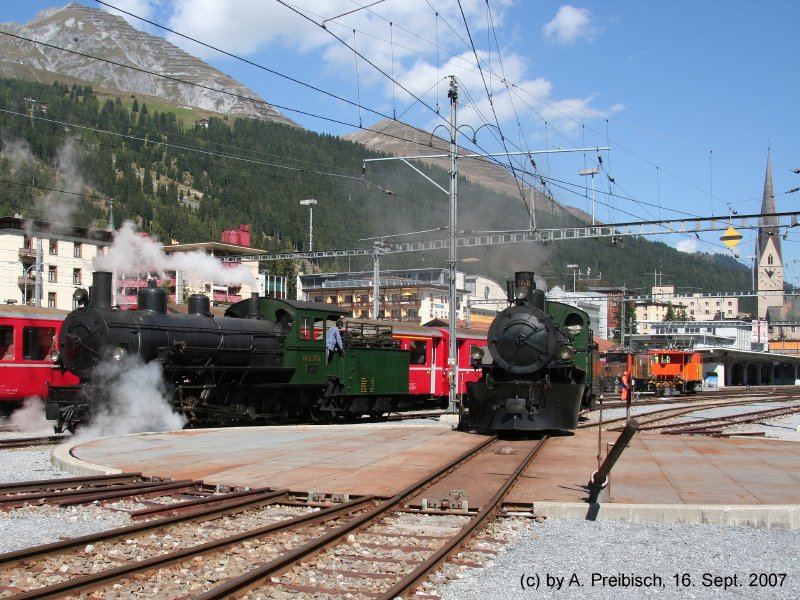 G 4/5 107 "Albula" und G 4/5 108 "Engiadina" kurz nach dem Wasserfassen im Bahnhof von Davos am 16. September 2007. Im Hintergrund ist noch das Krokodil Ge 6/6 I 414 und der el. Rangiertraktor Te 2/2 72 zu sehen. Andreas Preibisch