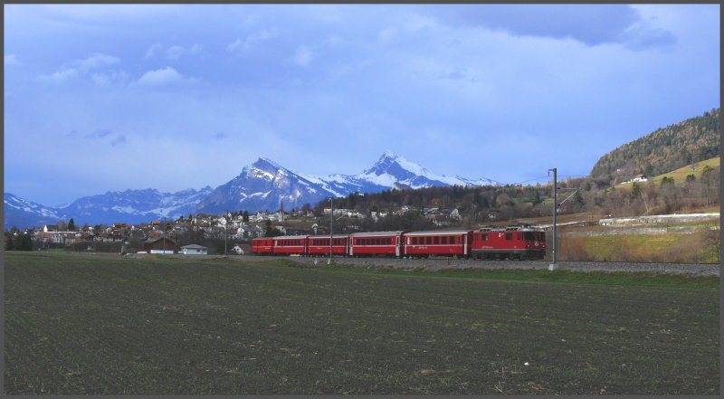 R1545 Schiers-Rhäzüns bei Malans mit Be 4/4 515 Pendel. Im Hintergrund sind der Gonzen und Alvier zu sehen. Der Gonzen erhebt sich unmittelbar hinter Sargans. Dort wurde früher Eisenerz abgebaut und die Miene kann heute mit einer Stollenbahn besucht werden. (22.11.2007) Herbert Graf