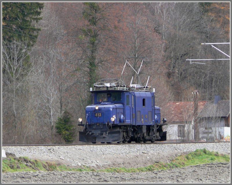 Ge 6/6 I 412 hat drei leere Holzwagen ins vordere Prättigau gebracht und passiert auf der Rückfahrt die ersten Rebberge der Bündner Herrschaft bei Malans. (22.11.2007) Herbert Graf