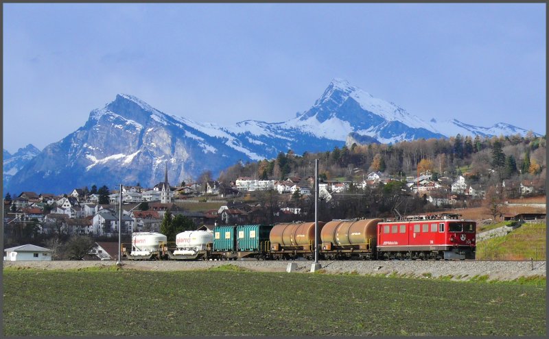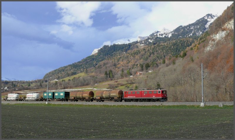 Wegen der Föhnwolken war es eine Lotterie einen Sonnenstrahl zu erhaschen. Bei diesem Zug hats geklappt. Ge 6/6 II 704 "Davos" mit Güterzug ins Prättigau bei Malans mit Gonzen und Alvier im Hintergrund. (22.11.2007) Herbert Graf