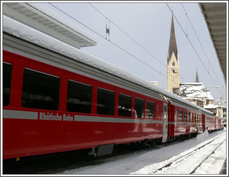 Der Entlastungszug Landquart-Davos Dorf-Davos Platz wegen des Spenglercups, welcher von der Ge 4/4 II 617 "Ilanz" gezogen wird oberhalb von Davos Laret. Aufgenommen am 27.12.07 Florian Hübscher