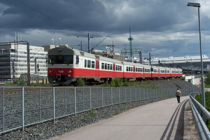 Geführt von einem Sm 1 (6003/6203) erreicht ein Zug der Linie A (Alberga - Hoplax - Böle - Helsingfors) den Bahnhof Böle. Die zweite Einheit ist ein Sm 2, der aus Leichtmetall gebaut wurde und keine gesickten Seitenwände besitzt. Vermutlich ist es 6072/6272. Die Einheiten bestehen aus Trieb- (60..) und Steuerwagen (62..). Aufnahmedatum: 19.06.2007 Olaf Just