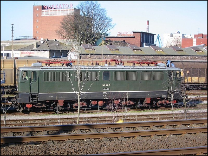 Am 11.03.2007 stand gegenüber dem S-Bahn-Haltepunkt Düsseldorf Hamm (nahe am Rheinhafen) die MTEG-Lok 142 001 vor einem Zug mit Autotransportwaggons. Leider wird die Lok von ein paar Ästen teilweise verdeckt, war aber nicht anders machbar. Wäre es irgendeine DB-Lok hätte ich auf ein Hochladen verzichtet, aber bei dieser eher selten anzutreffenden Lok ist es vielleicht gerade noch vertretbar. Thomas Schmidt