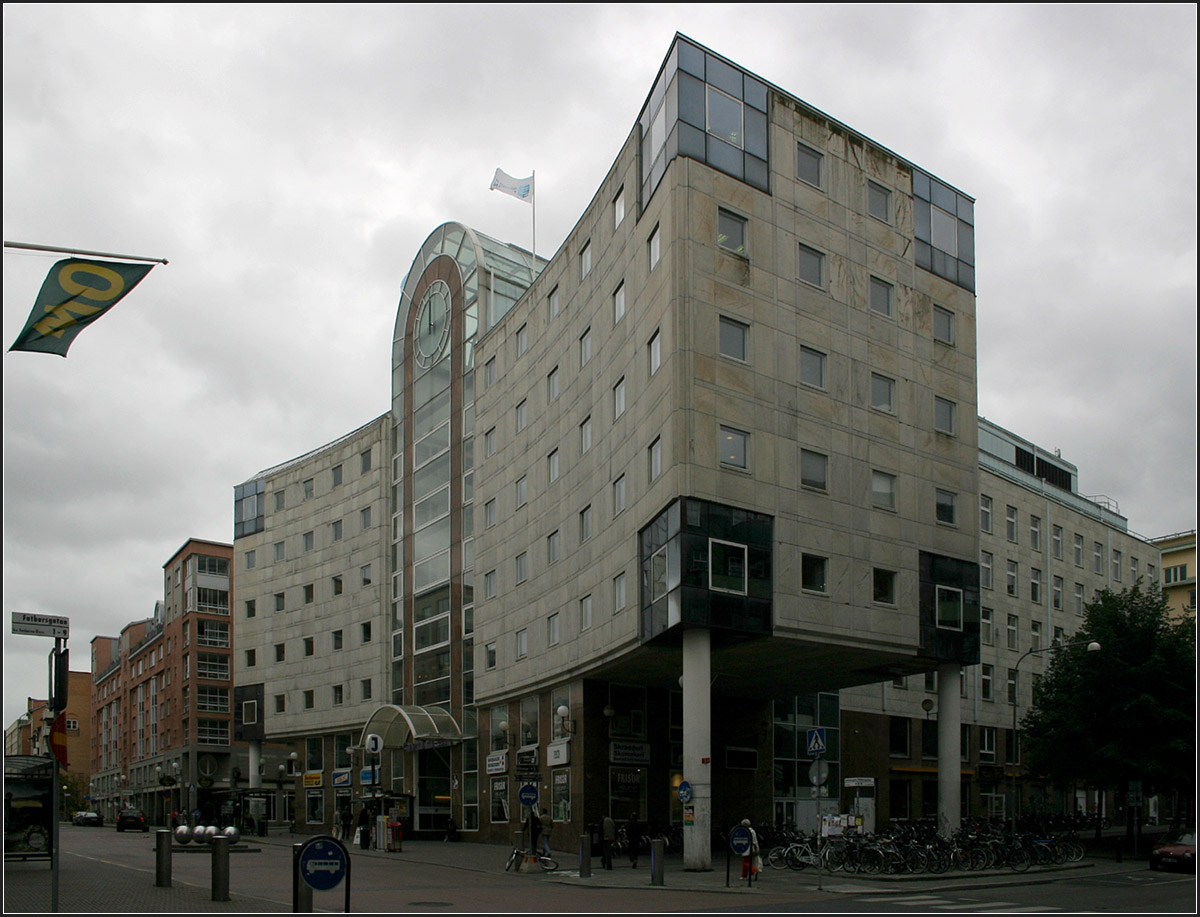 Stockholms södra: Außenansicht. Diese postmoderne Architektur ist nicht so mein Fall. Von hier aus sind es für Umsteiger etwa 300 Meter zur U-Bahn.