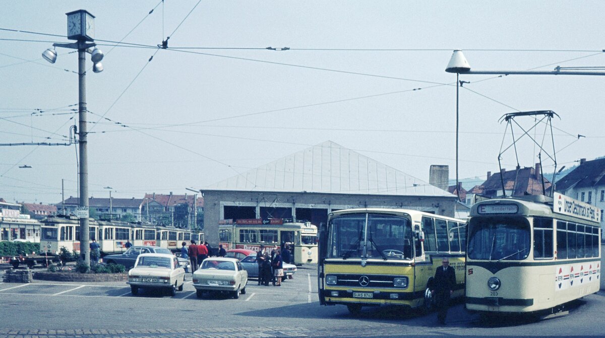 VAG Freiburg___Betriebshof Nord (Komturstraße).Tw 203[DUEWAG;GT 8,1972,GEAMATIC], SSB Reisebus, Tw 102 [Rastatt,1958 "Sputnik"] und sechs abgestellte Verbands-Tw [Rastatt, 1951-53]. Mit der Verlagerung zum Betriebshof West ab 1994 waren bis Anfang der 2000er Jahre in den Abstellhallen noch einige Reserve-Fahrzeuge abgestellt.2007 wichen die Hallen der Wohnbebauung.__20-04-1974 Klaus-Erich Lisk