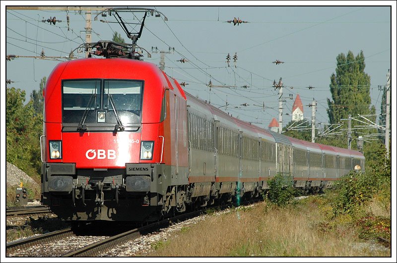 Er war ja bis zum Fahrplanwechsel im Dezember 2006 mit einer italienischen Garnitur und 1044er unterwegs. Heute sieht der EC 33 "Allegro Stradivari" von Wien nach Venezia Santa Lucia so aus. Die Aufnahme entstand ein paar Meter vor der S-Bahnstation Wien Atzgersdorf-Mauer am 30.9.2007. Hanspeter Reschinger