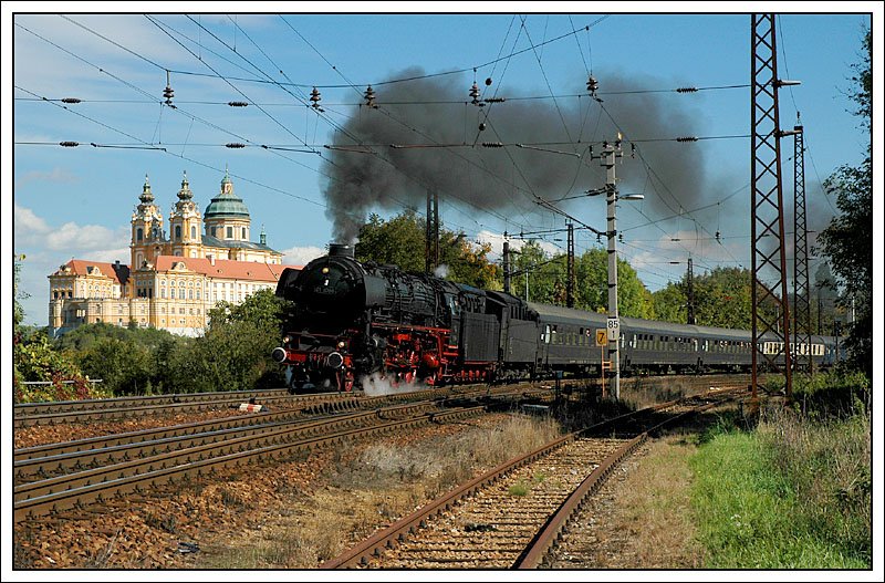 Die letzte Etappe der IGE Reise "Mit Volldampf zum Bosporus" übernahm am 29.9.2007 die deutsche ölgefeuerte 01 1066. Die Aufnahme zeigt den Sonderzug 16610 von Wien nach Nürnberg bei der Scheinausfahrt aus dem Bahnhof Melk. Hanspeter Reschinger