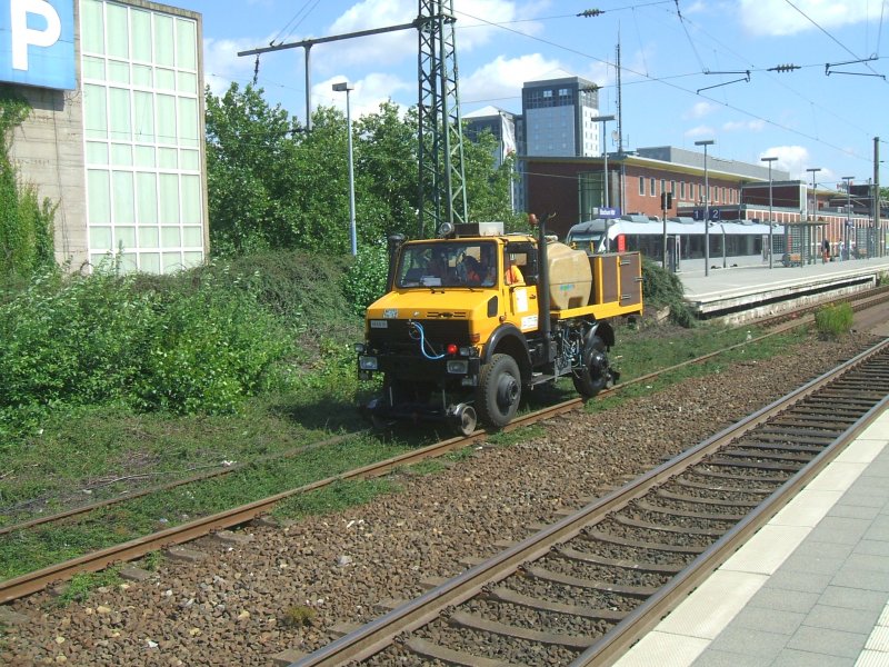 Mitarbeiter der DB fahren mit einem Unimog und sprühen rechts, links und zwischen den Gleisen Unkrautvertilgungsmittel im Bahnhof von Stralsund Roswitha Bartsch