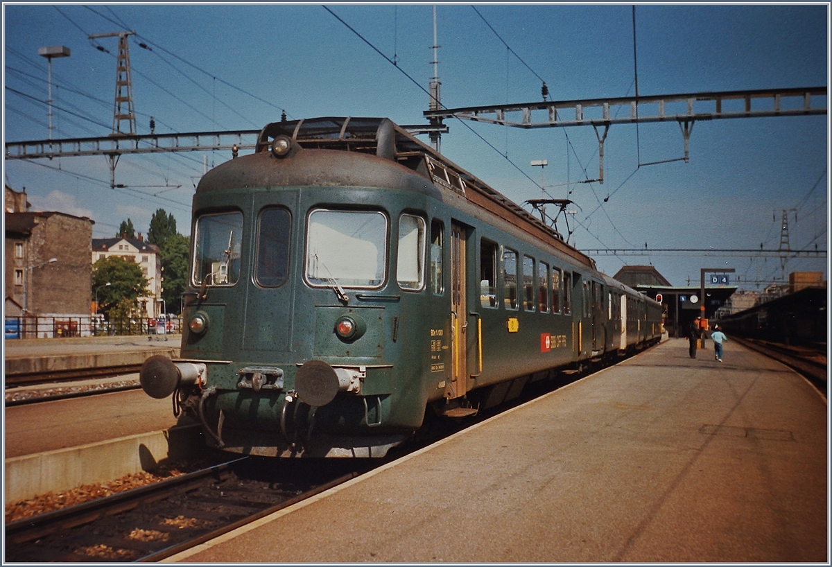 Gleichstrom BDe 4/4 N° 1301 Triebwagen für die nach SNCF-Norm elektrifizierte Strecke Genève - La Plaine im Oktober 1993 in Genève.