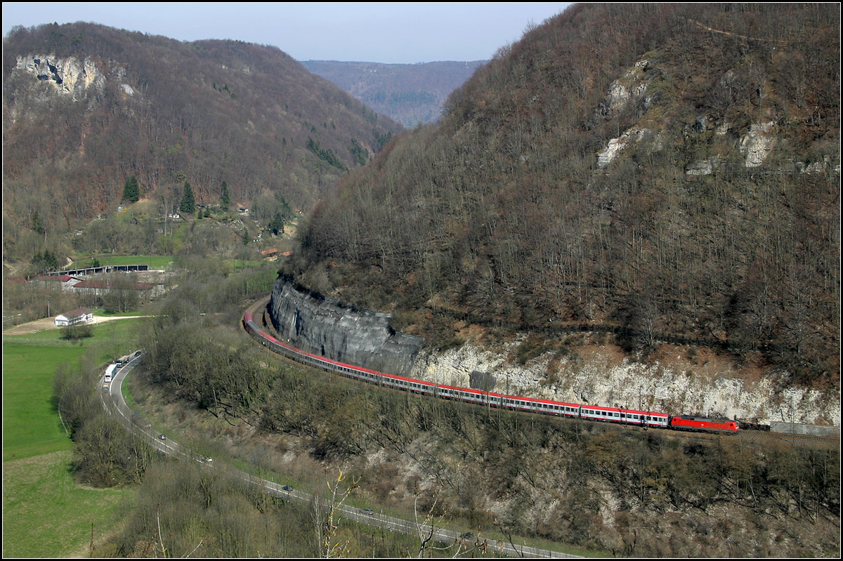 Die Aufnahme an dieser Stelle entstand sehr spontan; eine ganz freie Sicht war aufgrund der Bäume hier nicht möglich. Von hier aus hat man aber einen weiten Überblick entlang der Geislinger Steige. Unten kommt gerade ein Güterzug in Richtung Stuttgart um die Kurve, während oben rechts ein IC um eine weitere Kurve in Richtung München entschwindet.