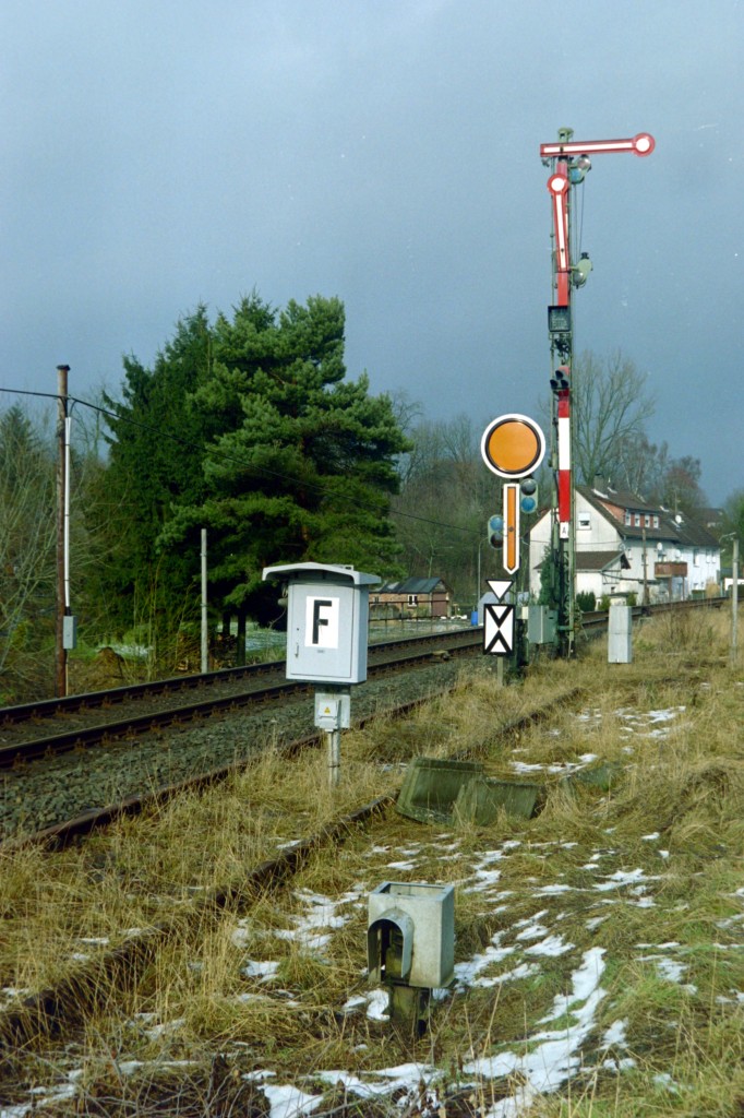 Das Einfahrsignal A des Bahnhofs Uslar, aufgenommen am 16.02.2006. Nach der Umstellung auf eingleisigen Betrieb zwischen Bodenfelde und Uslar am 17.07.1994 wurden Einfahrsignal und Ausfahrvorsignal im stillgelegten, aber nicht demontierten vormaligen Richtungsgleis Bodenfelde–Uslar platziert; seit dem 13.10.2008 wird der Bahnhof Uslar durch das ESTW "Göttingen Harz-Weser" gesteuert. Gustav Richard