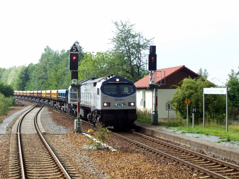 ITL 250 007-2 hat einen Güterzug mit Kalkmerkel von Rügen nach Wittenburg gebracht der hier auf der Ladestrasse entladen wird. 26.09.2008 Thomas Welzel