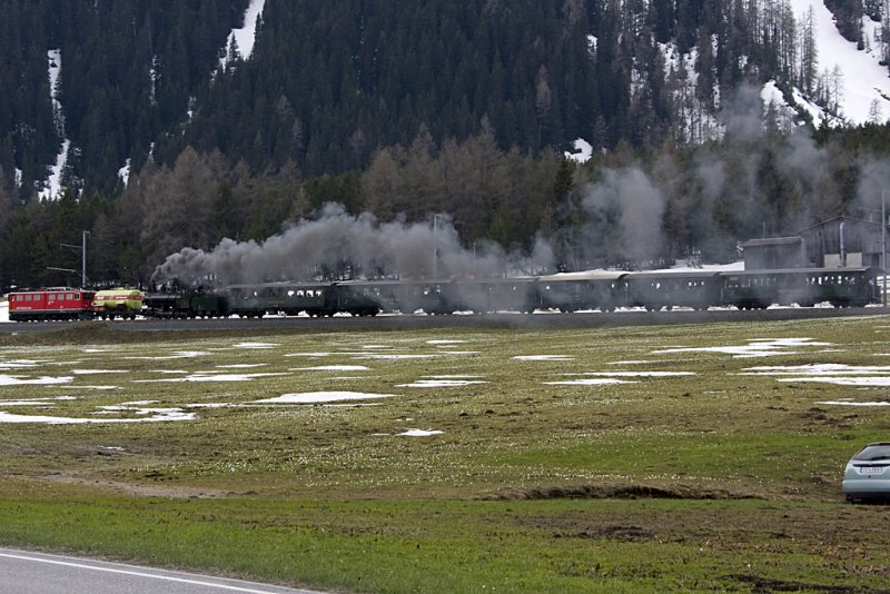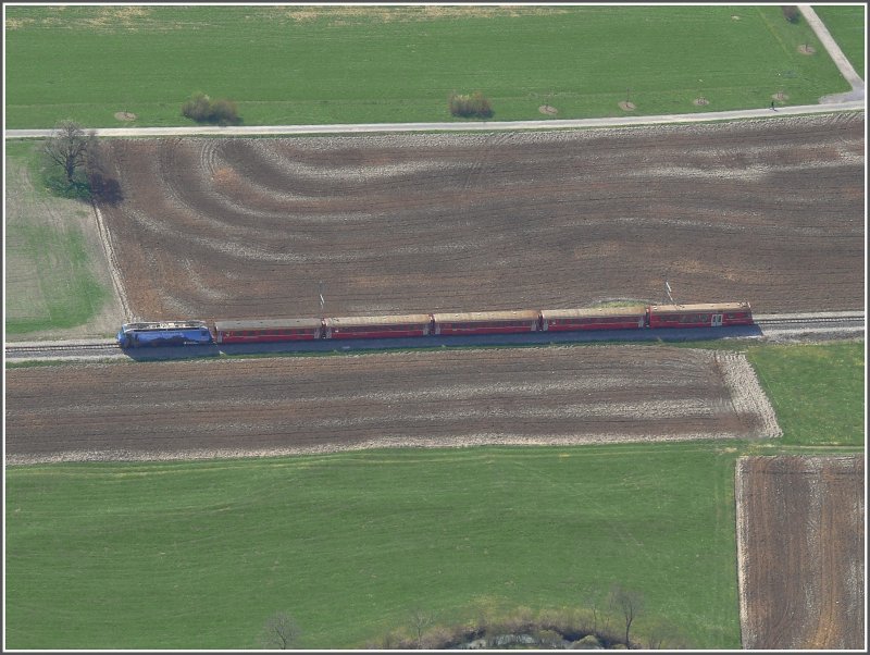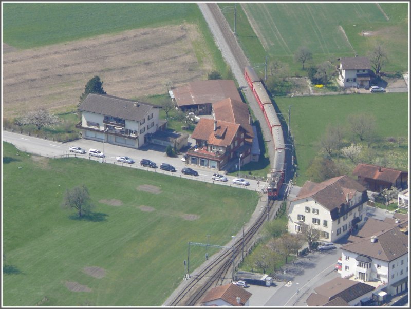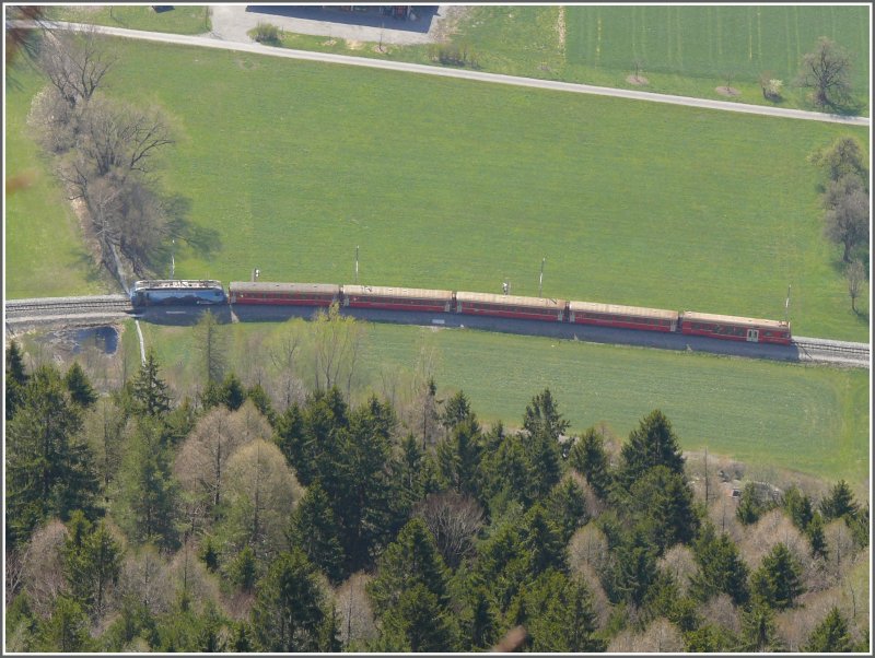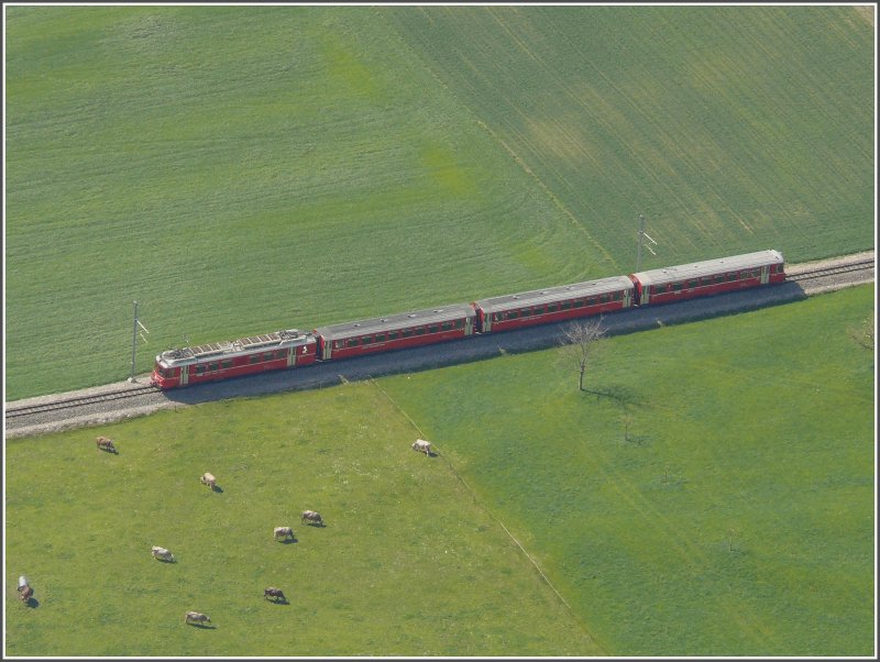 Wenig später folgt R 1534 als S8 nach Schiers. Zug und Kühe muten an wie ein Modell aus dieser Höhe und was erstaunlicherweise hier oben am besten zu hören ist, sind die Warnsignale der 2km entfernten Barriere von Malans. (13.04.2008) Herbert Graf