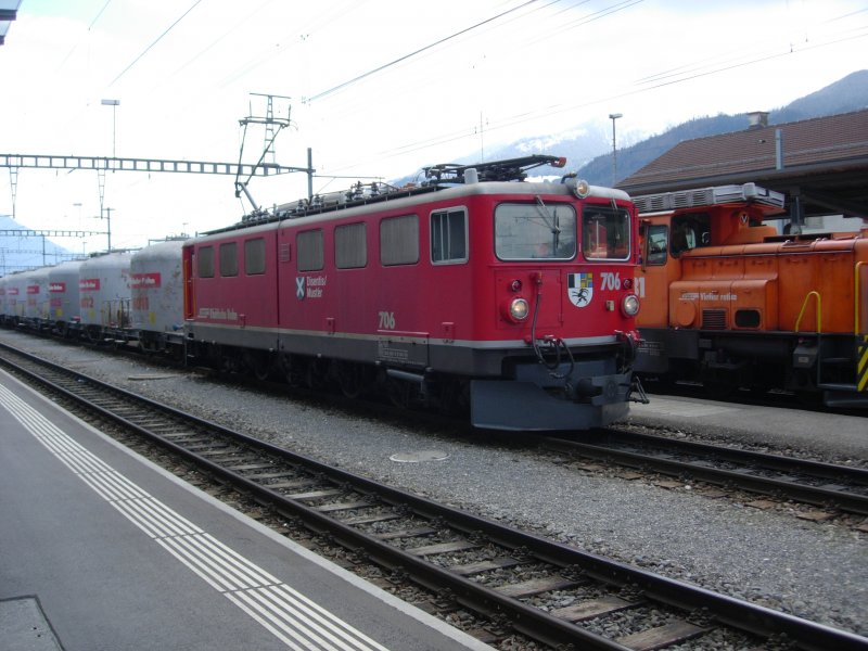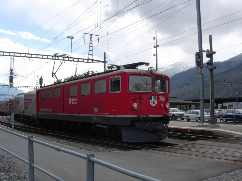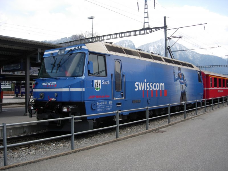 Unmittelbar hinter dem RE 1041 nach Davos folgt der RE 1241 nach Scuol-Tarasp und biegt soeben in den Bahnhof Malans ein. Zug lok ist eine Ge 4/4 II. (13.04.2008) Herbert Graf