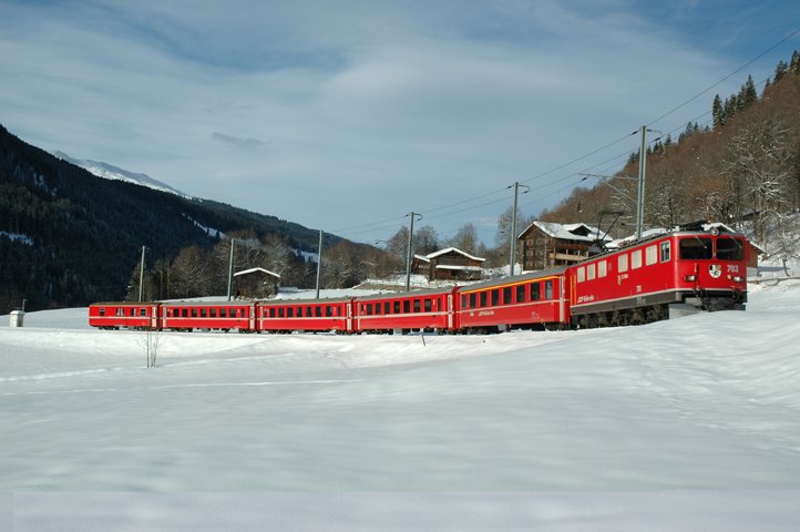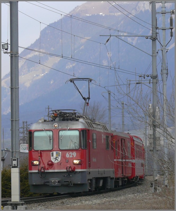 RE 1244 aus Scuol-Tarasp mit Ge 4/4 II 629 "S-chanf" fährt in Landquart ein. Links des Stromabnehmers sind die weissen Häuser von Guscha, dem Heididörfchen, zu sehen. (21.02.2008) Herbert Graf