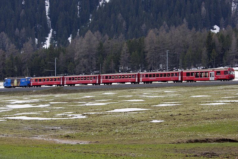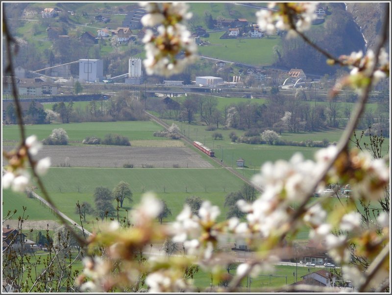 Nach dem Abstieg vom Fadärastein erreichen wir die ersten Kirschbäume oberhalb von Malans und schon kommt RE1245 nach Scuol-Tarasp ins Blickfeld. Er ist zwischen Landquart und Malans unterwegs. (13.04.2008) Herbert Graf