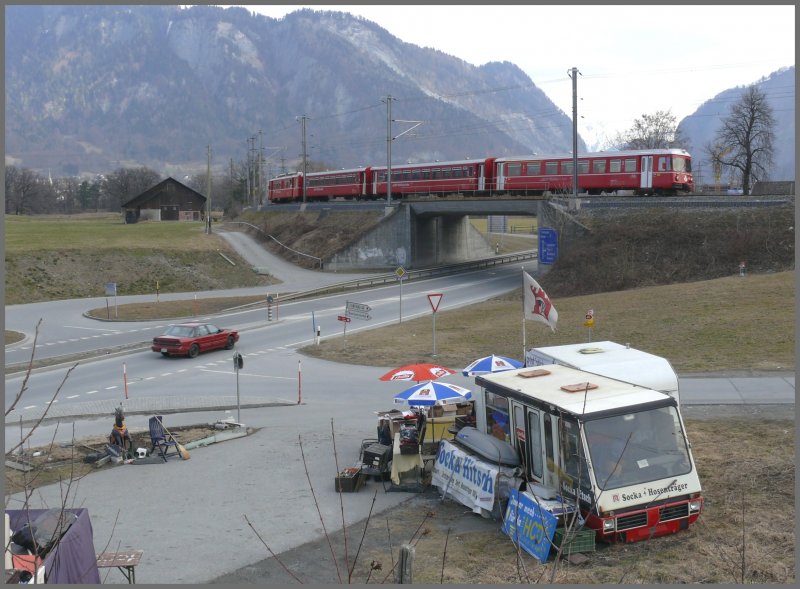 Zum Bahnhof Landquart gehört der Socken-Hitsch, ein Bündner Original, der unweit der Autobahnausfahrt seinen Verkaufsstand betreibt. Ein Be 4/4 Pendel überquert soeben die Strasse nach Davos auf dem Weg nach Schiers. (21.02.2008) Herbert Graf