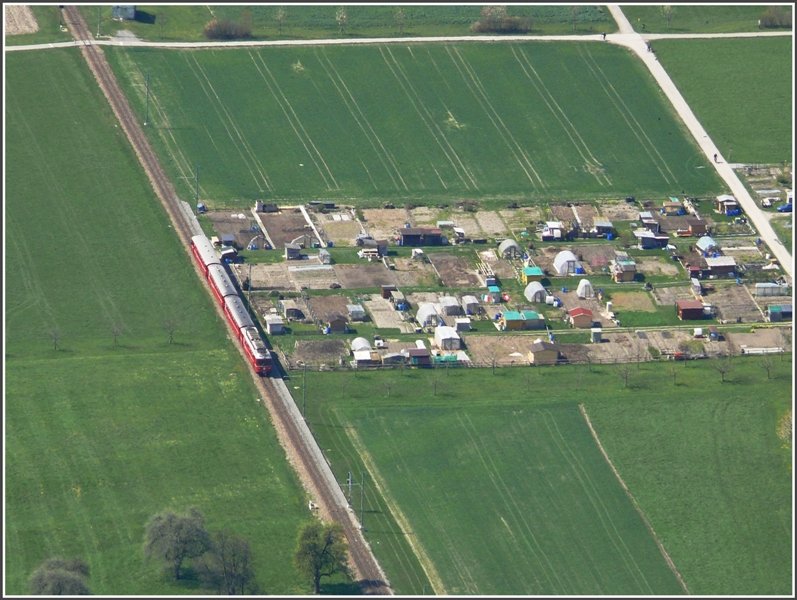 Zwischen Malans und Landquart fährt ein Be 4/4 Triebzug an einer Schrebergärtenansammlung vorbei. Fotografiert vom Fadärastein aus. (13.04.2008) Herbert Graf