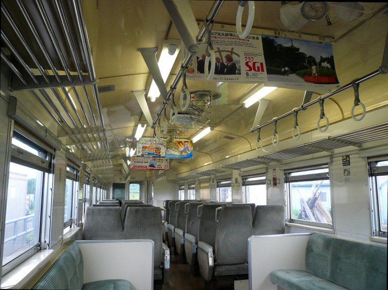 Rumoi-Linie, Hokkaidô-Westküste: Das erstaunlich komfortable Innere des Triebwagens KIHA 54 527. (KI キ =Dieseltriebwagen; HA ハ = gewöhnlicher Sitzwagen). Erkennbar ist das zusätzliche Innenfenster, das im sehr kalten Hokkaidô-Winter herabgelassen werden kann. 28.August 2008. RUMOI-LINIE Peter Ackermann