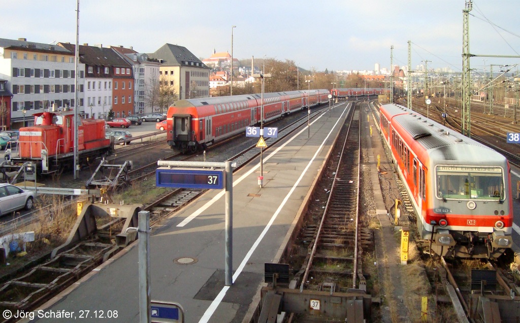 Einst und jetzt im Bergischen Land: Auf dem oberen Bild verlässt Mitte der 1980er Jahre 212 319-0 mit einem Nahverkehrszug nach Wuppertal den (damaligen) Solinger Hauptbahnhof, unten wurde im Sommer 2008 an gleicher Stelle ein 628 auf der Fahrt von Wuppertal-Oberbarmen nach Solingen Hauptbahnhof (neu) aufgenommen. Vieles hat sich in der Zwischenzeit verändert: Der frühere im Hintergrund sichtbare, abseits des Stadtzentrums gelegene Solinger Hauptbahnhof ist stillgelegt, die Züge halten seit 2006 etwas weiter östlich im Bahnhof Solingen Mitte, auch die umfangreichen Gleisanlagen sind verschwunden. Und den Namen Solingen Hauptbahnhof trägt inzwischen der an der Hauptstrecke von Wuppertal nach Köln gelegene frühere Bahnhof Solingen-Ohligs. Horst Lüdicke