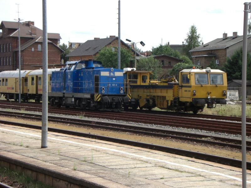 Schienenschleifzug SBM 250 abgestellt in Weißwasser neben der Press 293 021-6 am 13.08.2008