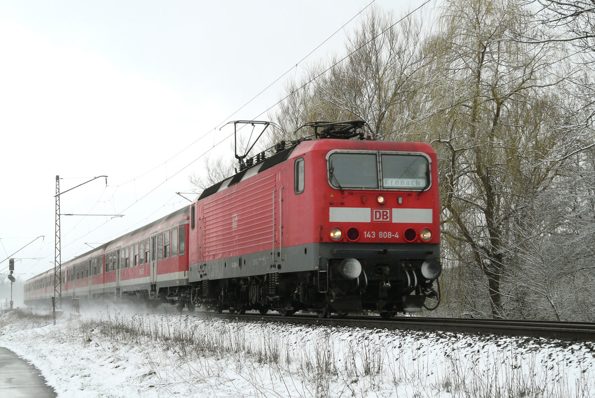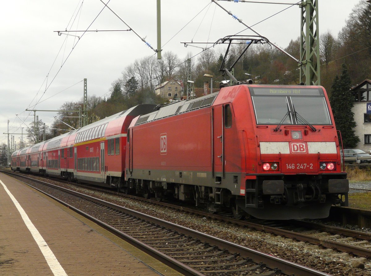 05. Dezember 2008, Das habe ich in Kronach noch nicht gesehen: Die regulär zwischen Nürnberg und Sonneberg verkehrenden Züge, bespannt mit Loks der BR 146, endeten heute teilweise in Kronach. Sie übernahmen die Rolle der sonst aus "Silberlingen" bestehenden Schülerzüge. Hier wartet Lok 146 247 mit ihrem Dosto-Zug auf das Signal zur Ausfahrt. Jürgen Krause