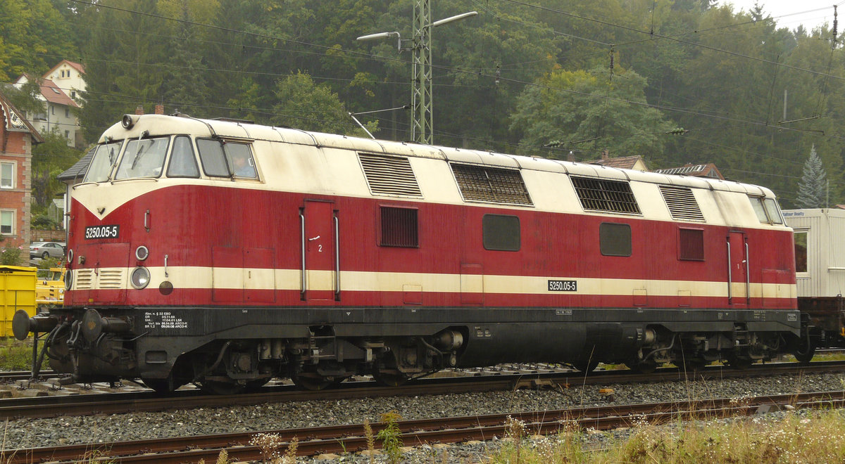 23. September 2008, Zwischen Kronach und Pressig-Rothenkirchen finden Oberleitungsbauarbeiten statt. Als Zuglok für den Bauzug fungiert ARCO-Lok 5250.05, die ehemalige V180 742 der DR, Baujahr 1968 Jürgen Krause