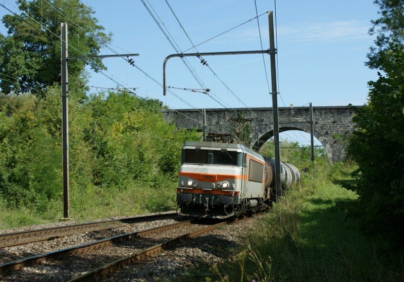 Gegen halb zwölf vermochte die Sonne die Brücke im Hintergrund dezent anzuleuchten, als die Gleichstrom BB 7424 mit ihrem Güterzug von Genève Richtung Frankreich unterwegs war.