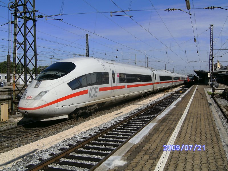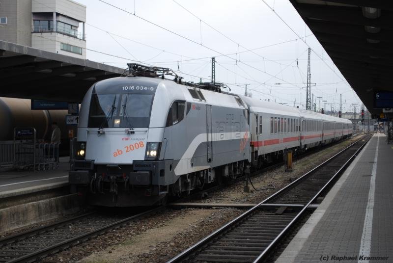 Am 19.03.09 bringt die Taurus-Lok 1016 034-9 in Railjet-Lackierung ihren EC nach Augsburg. Die abgewandte Front der Lok trägt die Aufschift übrigens nicht. Raphael Krammer