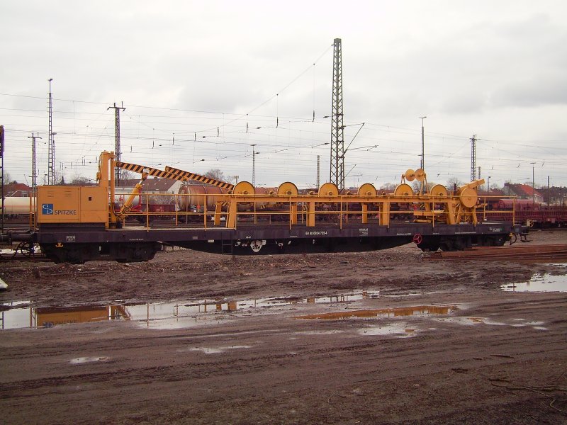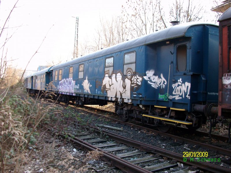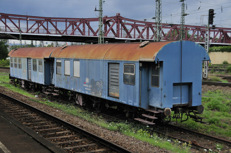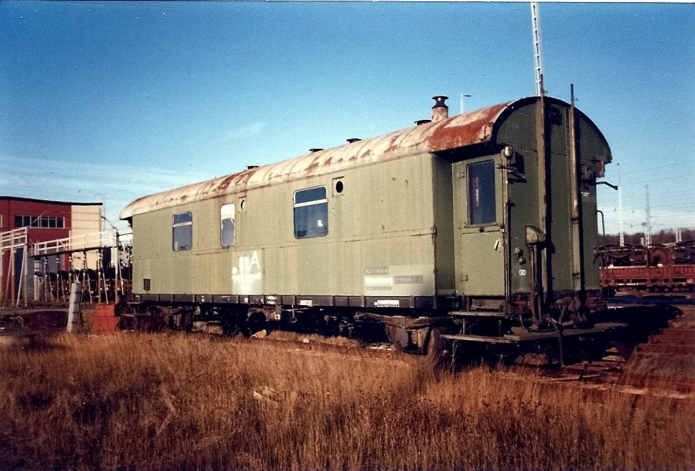 Begleiterwagen für Gleisbaumaschinen, umgebaut bei der DR in den 80-er Jahren aus Bghw-Wagen. Heute im Eigentim der DGT (Deutsche Gleis- und Tiefbau GmbH). Enthält mehrere Schlafabteile, einen Aufenthaltsraum mit Anrichte sowie WC/Dusche. Aufnahmedatum 1.5.2009, Rbf. Wustermark anläßlich Fahrzeugausstellung zum 75. Jubiläum. Andreas Bogott