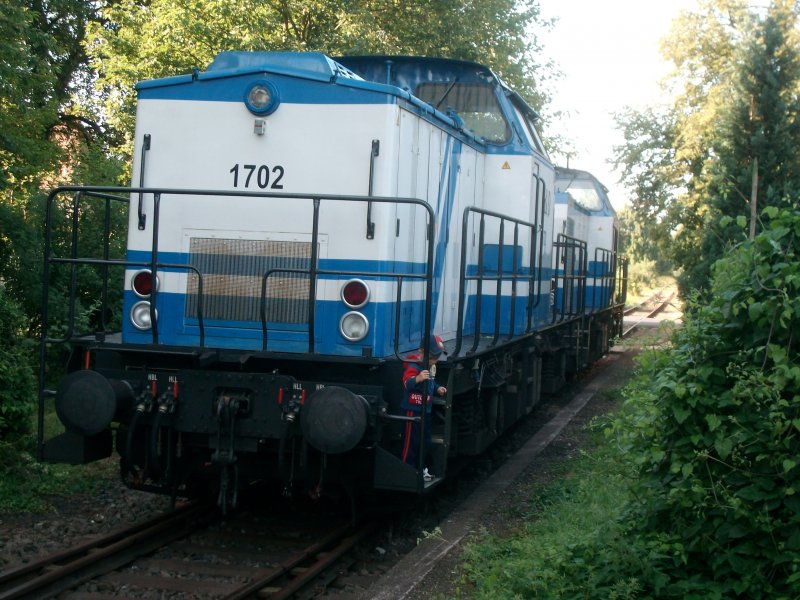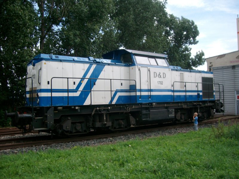 Die D&D Lok 1702 wartet am 1.8.09 in Bad Langensalza Ost auf ihre Schwesterlok 1701,die in der Heyl-Mühle rangieren tut.Sie fahren zu zweit,von Bad Langensalza Ost nach Bremen und zurück. Heiko Neumann