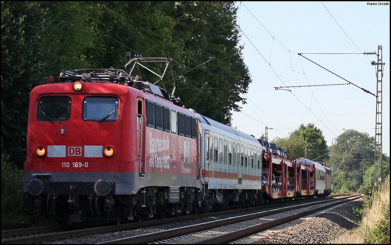 Unsere erste Sichtung der 110 169-0, dem neuem Mitglied der Bahntechnik mit Kompetenz-Truppe. Hier aus Lichttechnischen Gründen als Nachschuss. Aufgenommen am 27.08.2009 bei Dedensen/Gümmer. Jens Baumhauer