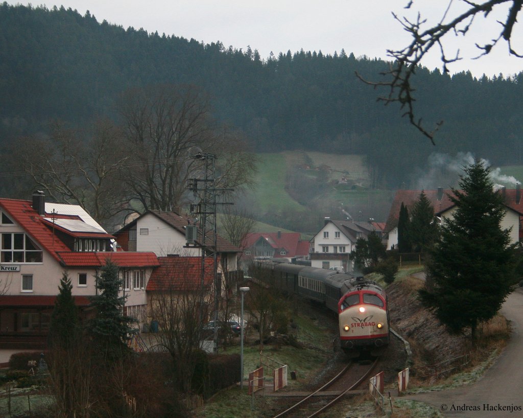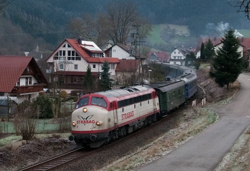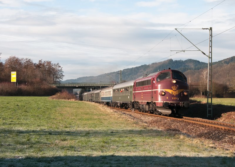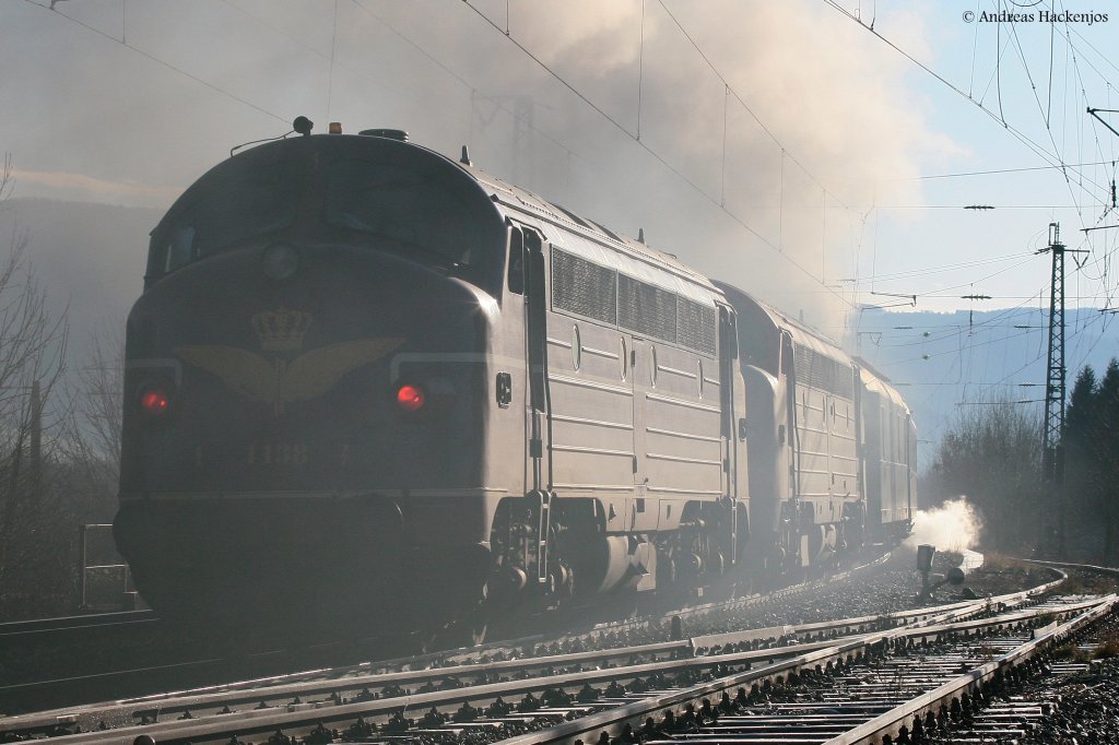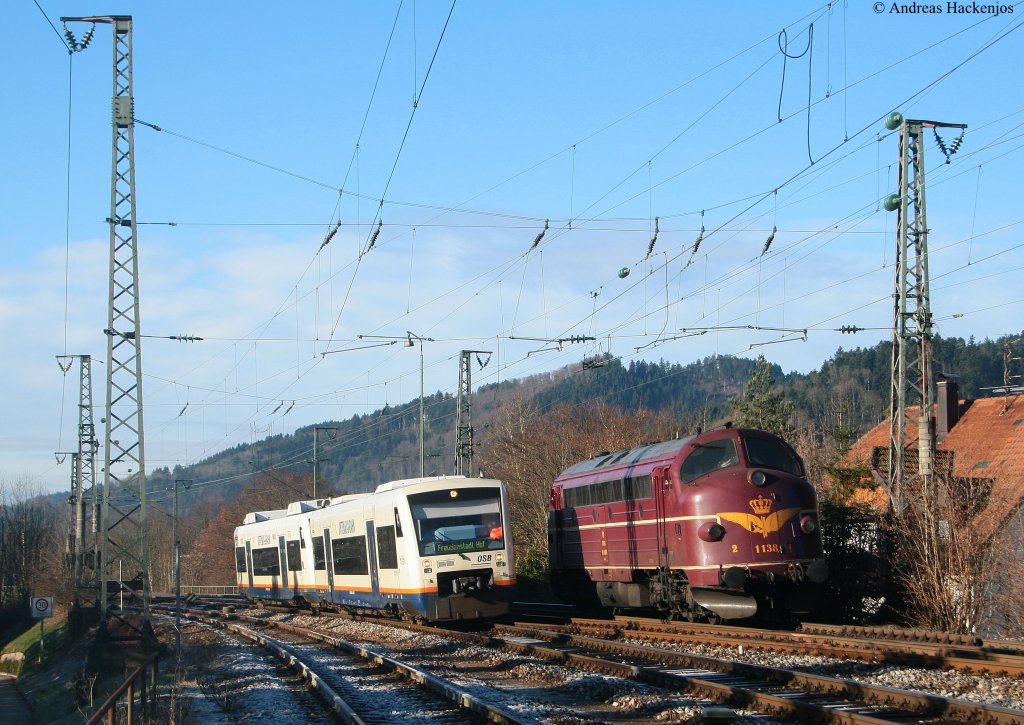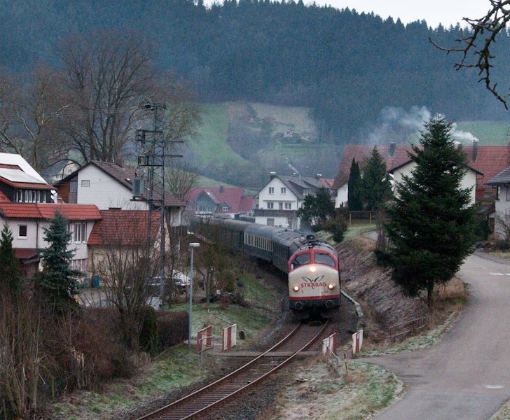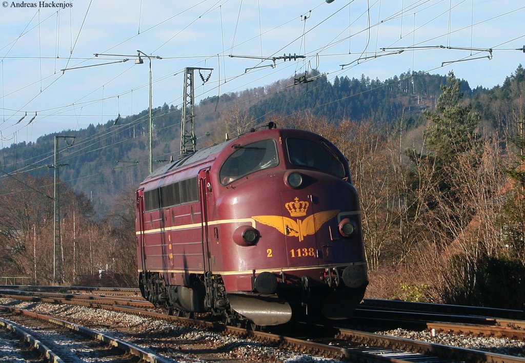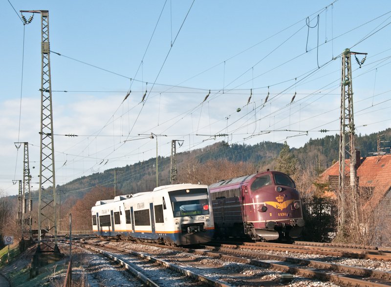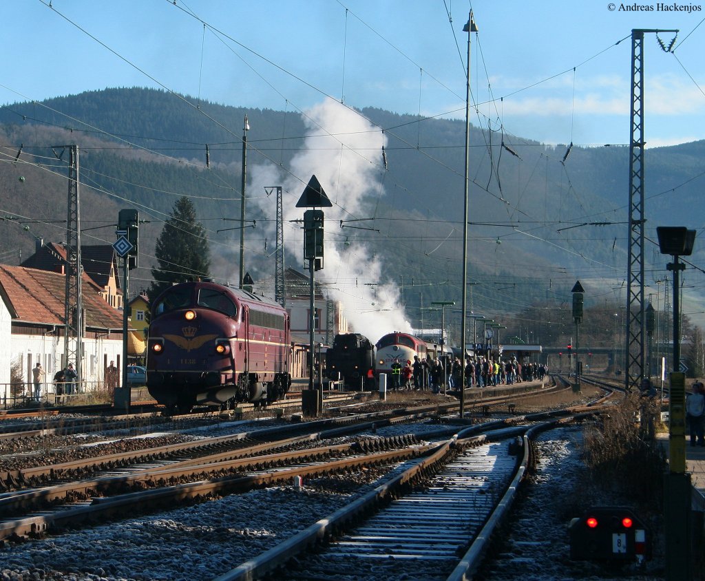 Seltenes Treffen in Hausach: Während OSB87329 nach Freudenstadt gleich in den Bahnhof einfährt, rangiert daneben die Nohab My 1138. Sie löst 01 1066 ab, die den Sonderzug von Mainz-Bischofsheim bis nach Hausach geführt hatte, jedoch aufgrund ihres Gewichtes nicht auf die Kinzigtalbahn darf. Die My 1138 brachte den Zug dann weiter nach Alpirsbach. 27. Dezember 2009. Marvin