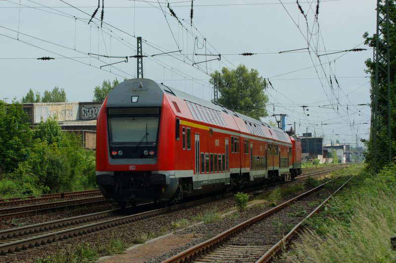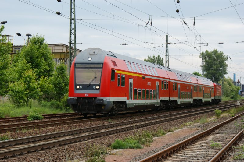 Vermutlich der kürzeste RE, mit dem die DB AG auf ihren Schienen unterwegs ist. Es ist der RE aus Leipzig/Halle Flughafen nach Leipzig Hbf über Leipzig Messe. Hier ist er beim einzigen Unterwegshalt zu sehen. Oder hat noch einer nur 3 Stationen? 15.08.2009 Hannes Müller