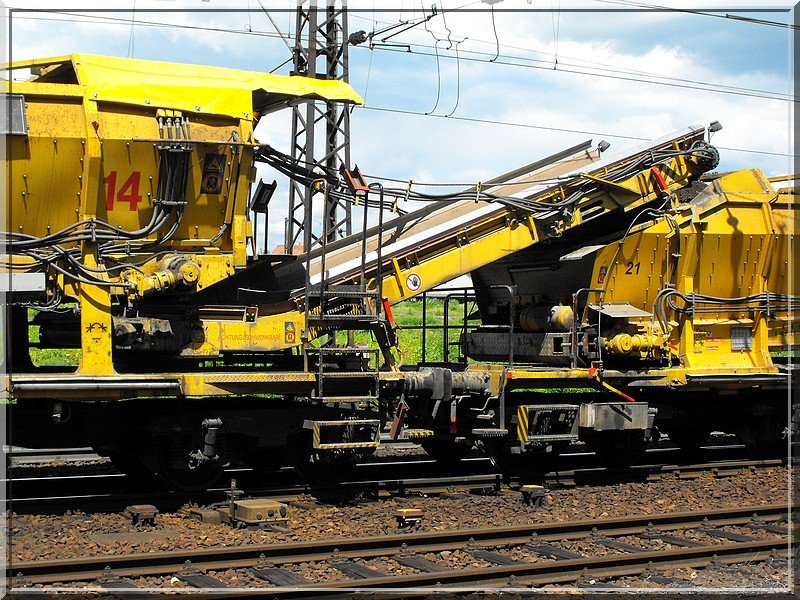 Detail der verbindung mit Förderband zweier Wagen des Schotterreinigungszuges in denen der Dreck und unbrauchbare Schotter gelagert,und abtransportiert wird.(7.6.2009) Marcel Lober