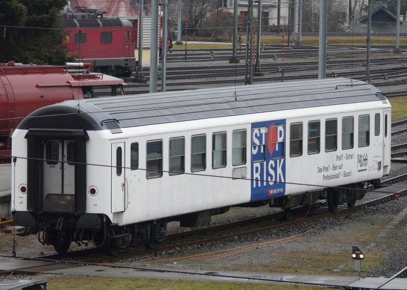 SBB - ex Personenwagen als Dienstwagen( bfu STOP RISK ) X 60 85 99-33 927-2 im Depotareal von Biel/Bienne am 08.02.2009