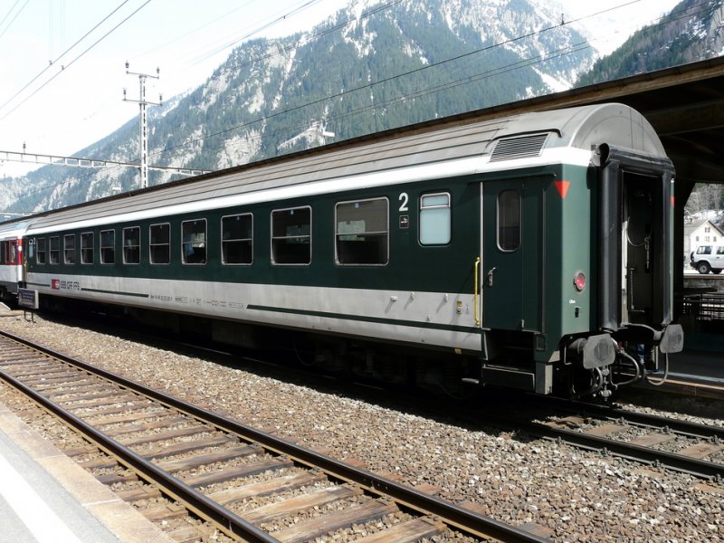SBB - Personenwagen 2 Kl. B 51 85 21-70 318-2 im Bahnhof von Göschenen am 08.04.2009
