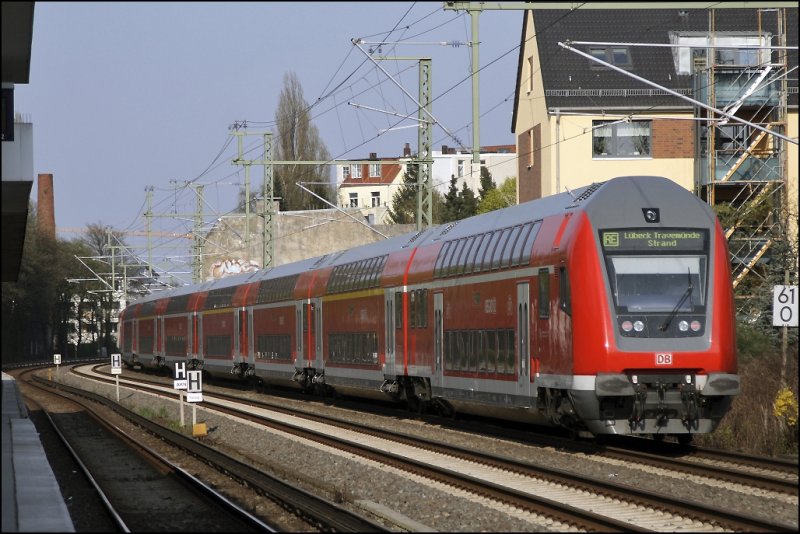 Während die RE´s nach Lübeck Travemünde-Strand aus Dostos bestehen, verkehren die RB´s nach Ahrensburg mit n-Wagen. Hier ist RB 21376 bei Landwehr unterwegs. (11.04.2009) Florian Böttcher