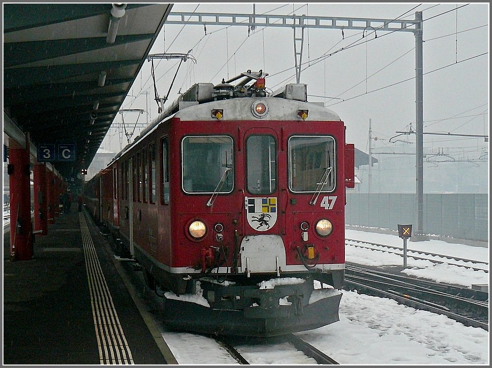 Im leicht verschneiten Tirano kommt ABe 4/4 III 52 "Brusio" an, um kurze Zeit später seine Reise über den Bernina Pass wieder anzutreten. 24.12.09 (Hans) De Rond Hans und Jeanny