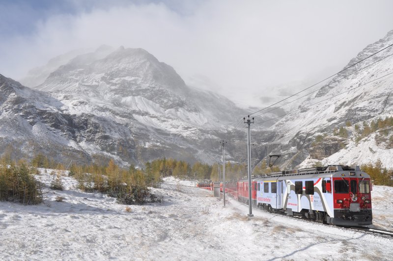 Die ABe 4/4 III 51 "Poschiavo" und 55 "Diavolezza" verlassen die Alp Grüm am 12.10.09 mit dem D 970 BERNINA EXPRESS Tirano - St. Moritz. Florian Hübscher