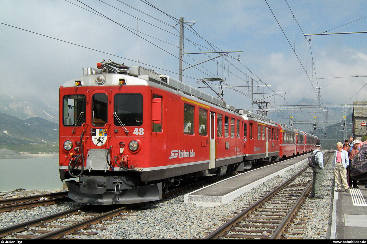 Immer noch 2009, wieder Ospizio Bernina, aber knapp 2 Monate nach dem vorherigen Bild. Am 14. Juli warten ABe 4/4 II 48 und 46 mit einem Bernina Express auf die Ausfahrt in Richtung Tirano. Julian Ryf