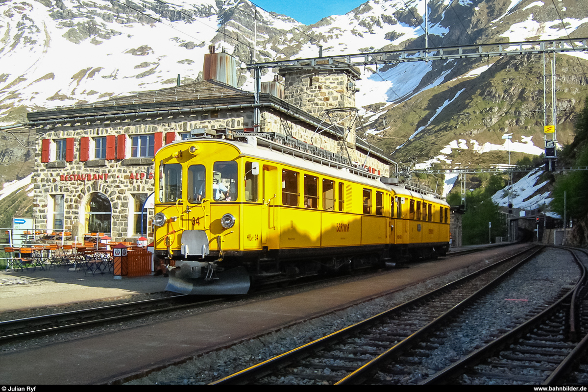 Vor der Ablieferung der ersten Allegras, bestanden am Morgen gute Chancen, auf dem ersten südwärts fahrenden Zug des Tages die beiden historischen Triebwagen ABe 4/4 I 30 und 34 anzutreffen. Anlässlich einer Klubreise des Könizer Eisenbahnklubs KEK konnte ich die Gelegenheit nutzen, noch einmal den damals noch sehr abwechslungsreichen Fahrzeugpark der Berninalinie zu besichtigen. Das Bild entstand am Morgen des 24. Mai 2009 auf der Alp Grüm. Julian Ryf