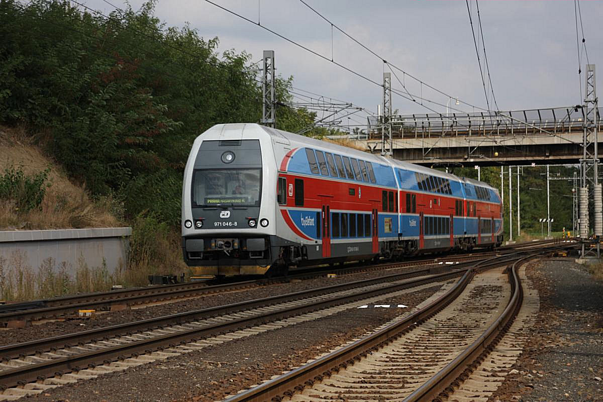 City Elefant 971038 (Steuerwagen Seite) hält am 11.9.2009 im Bahnhof Zabori nad Labem auf dem Weg nach Pardubice. Zwei Güterzüge stehen derweil im Bahnhof und warten auf eine Lücke im Personenverkehr, um ebenfalls in Richtung Pardubitz weiter fahren zu können. Gerd Hahn