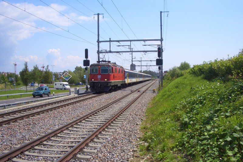 Die ICE-Krise scheint wohl noch nicht beigelegt zu sein. So fuhr am 23.6.09 die Re 4/4'' 11114 mit 4Bpm und 1Apm als ICE nach Singen (und danach mit DB-Bepsannung weiter nach Stuttgart). Hier sieht man, wie der Ersatzzug Bülach verlässt. Silvio Jenny