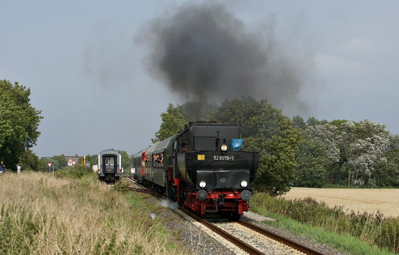 52 8079-7 am 15.08.2009 mit einer aus 2 ehemaligen Reichsbahnwagen, einem Heizwagen und zwei IC-Kurswagen der DB gebildeten Garnitur als neg nach Dagebüll Mole bei der Ausfahrt aus dem Kreuzungsbahnhof Blocksberg.Dort wurde zuvor mit 628/629 071-2 passiert, welcher ebenfalls zwei Kurswagen mitsichführte. Julian Düll