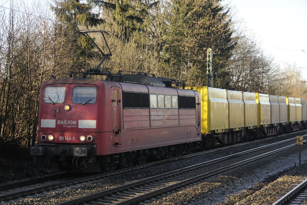 Eine von Dreien mit roter "Bauchbinde", aber mit Balken: 151 144-3 zieht einen Hackschnitzel-Ganzzug Richtung Rosenheim. (Gronsdorf, 03.12.2009). Helmut Dimitroff