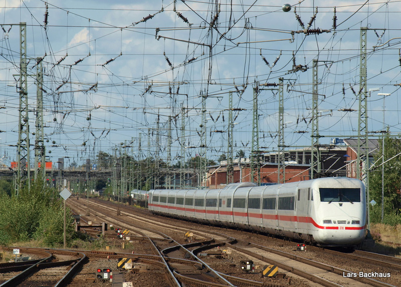 Blick entlang des ICE 76 aus Zürich HB kurz nach der Ausfahrt am 22.08.09 in Neumünster. Die Dächer hinter dem ICE gehören zum AW Neumünster. Lars Backhaus